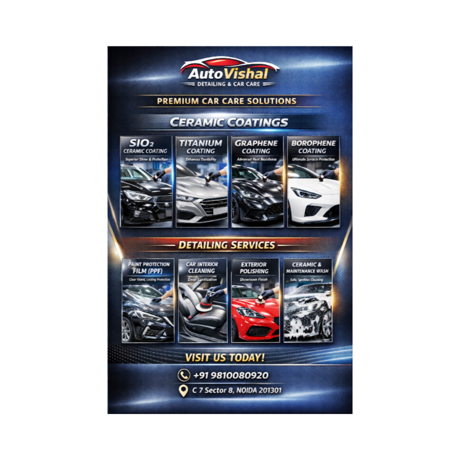 AutoVishal offers expert application of SiOโ, Titanium, Graphene, and Borophene coatings with proper booth baking technology for long-lasting results.
